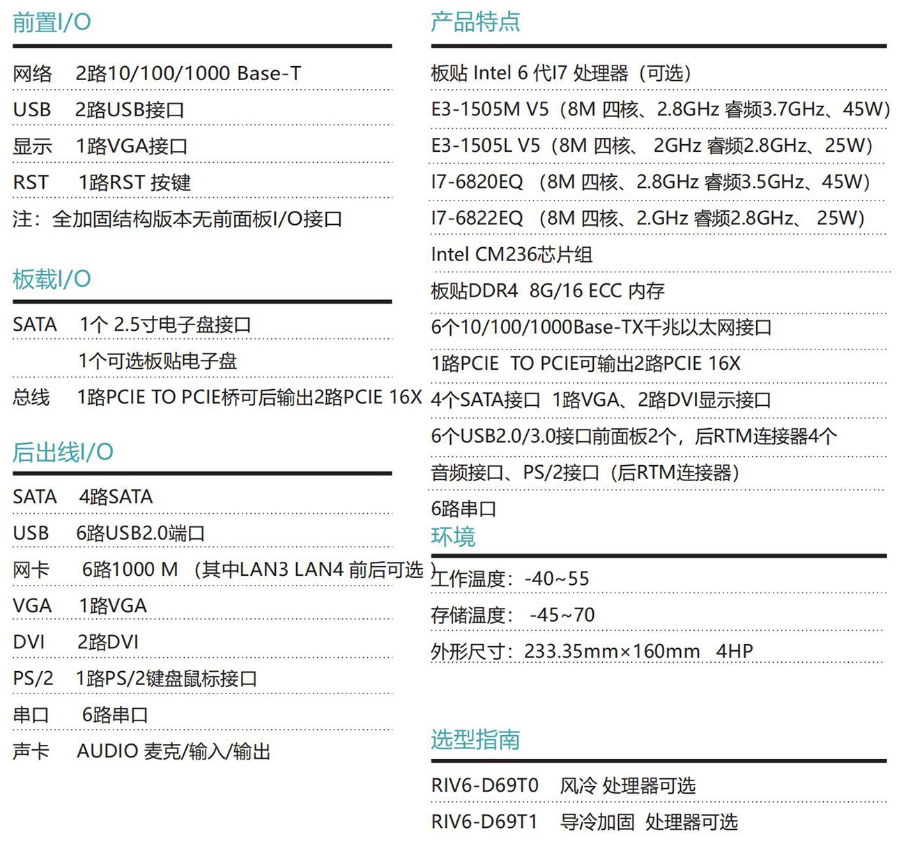 面板2路USB2.0及1路VGA,2路網絡接口; 備選板載SSD 64G;后IO接口: 后出2路16xPCIE;4路1000Base-T;1路10G網絡;6路 USB;6路 RS422/485S可 選 串 口 ; 1路 Audio;1路 KB/MS PS2;2路DVI;1路VGA;4路SATA;板上有BMC健康管理系統 可以偵測試溫度及主板工作狀態, 設計了高效的散熱系統,可顯著提高處理器的浮點運算性能,以太網、PCIe、支持高帶寬數據傳輸,專為惡劣環境使用而設計,滿足無人機、裝甲車、水面艦艇等軍工領域。