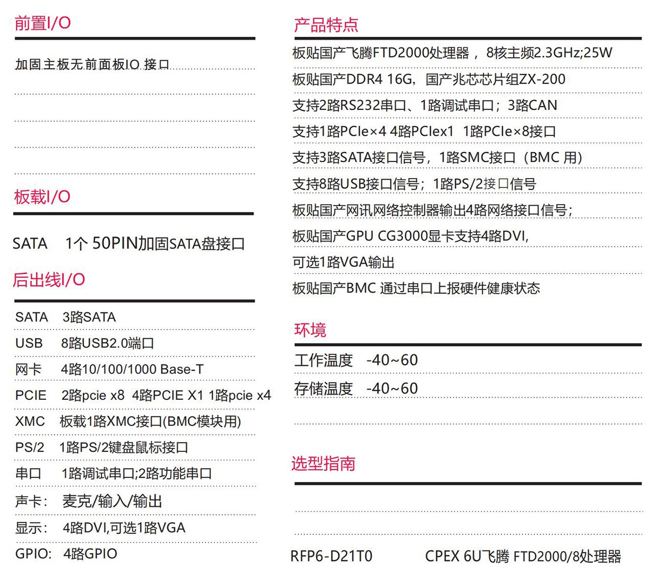 采用國產飛騰處理器+ZX-200芯片組國產化設計, 6U CPEX規格。具備豐富的外圍接口;設計了高效的散熱系統,可顯著提高處理器的浮點運算性能,以太 網、PCIe、支持高帶寬數據傳輸,滿足視頻采集與處理、雷達和聲吶等應用對高速數據傳輸的要求。滿足 無人機、裝甲車、水面艦艇等軍工領域。